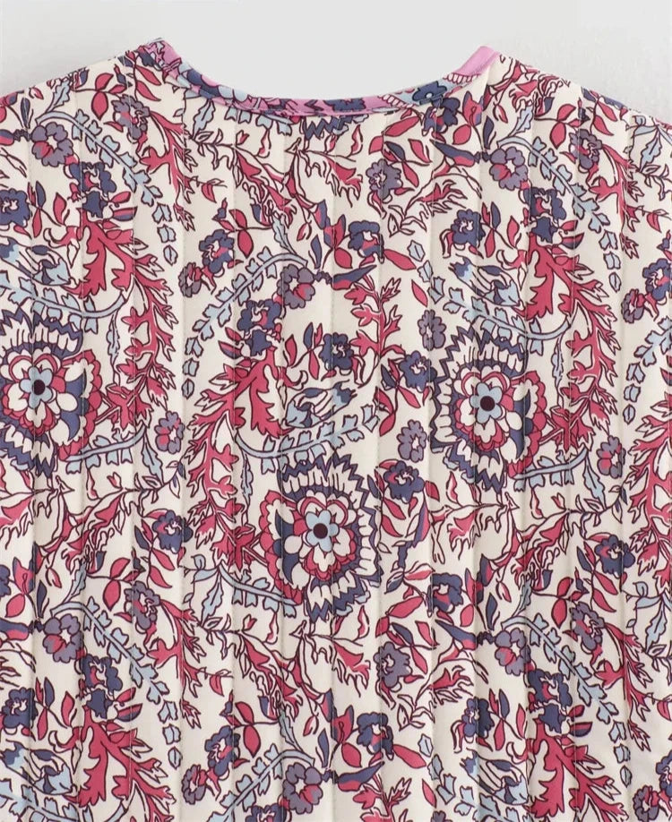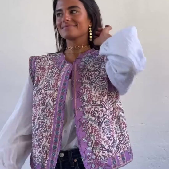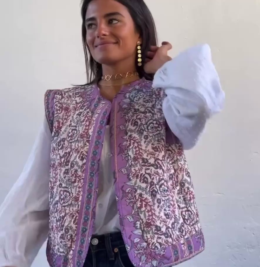Chaleco en tonos rosas y morados, no tiene botones.