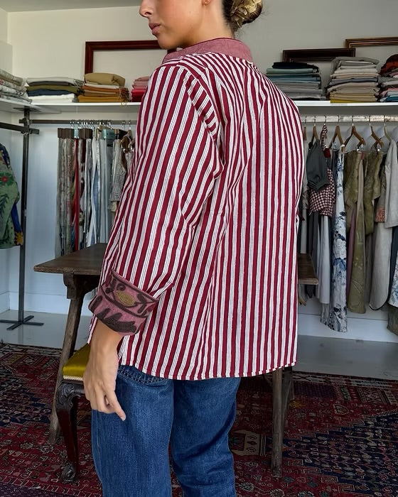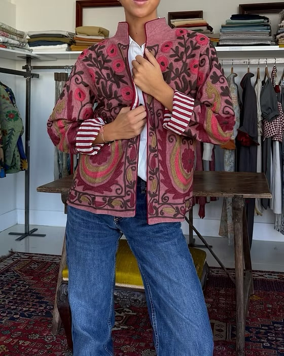 Diseñado para quienes valoran la artesanía, el color y la historia en cada puntada. Este saco es una pieza única elaborada con esmero en India, bordado a mano con la técnica Suzani, que destaca por sus exquisitas formas ornamentales y vibrantes combinaciones de colores.