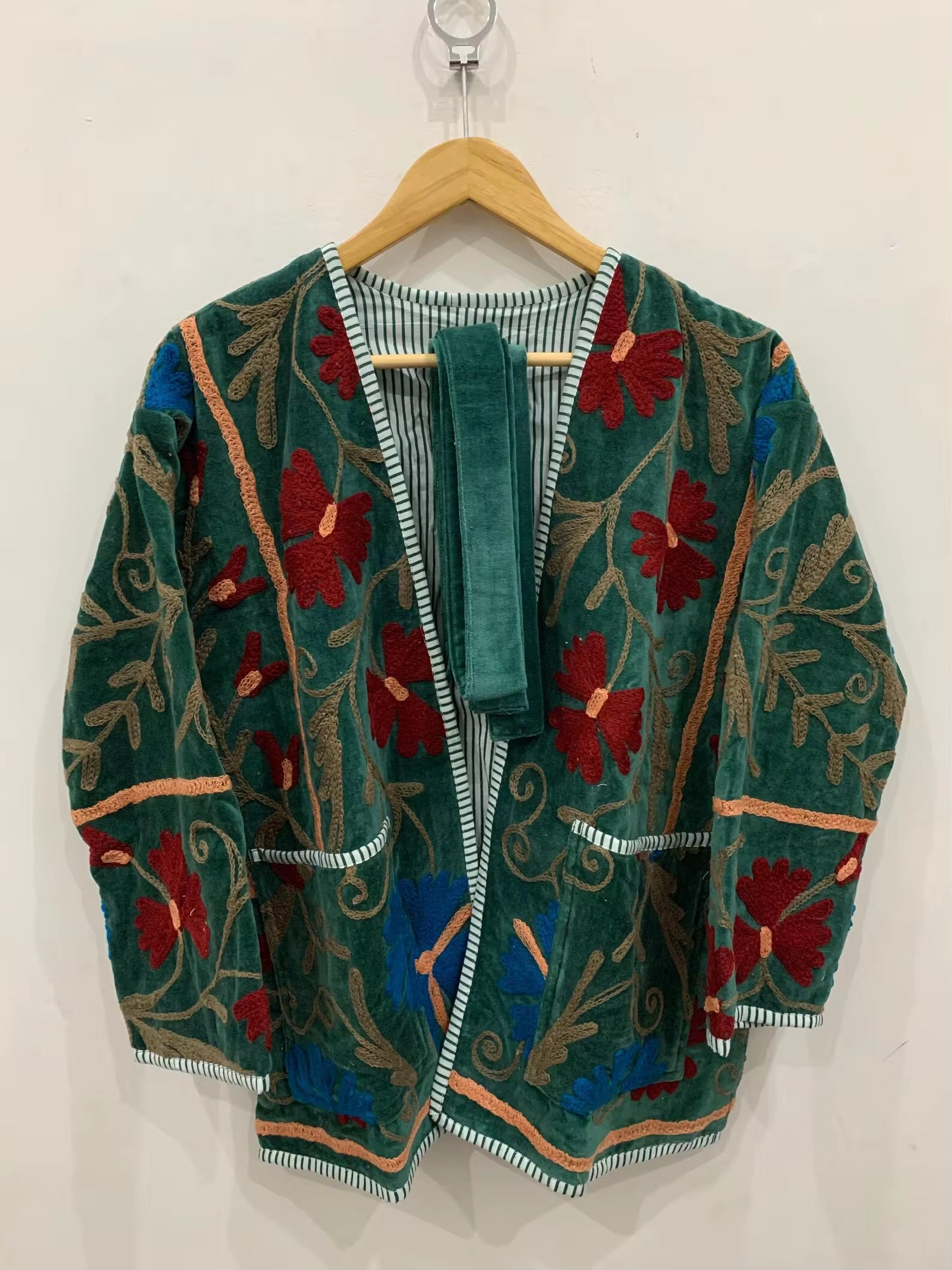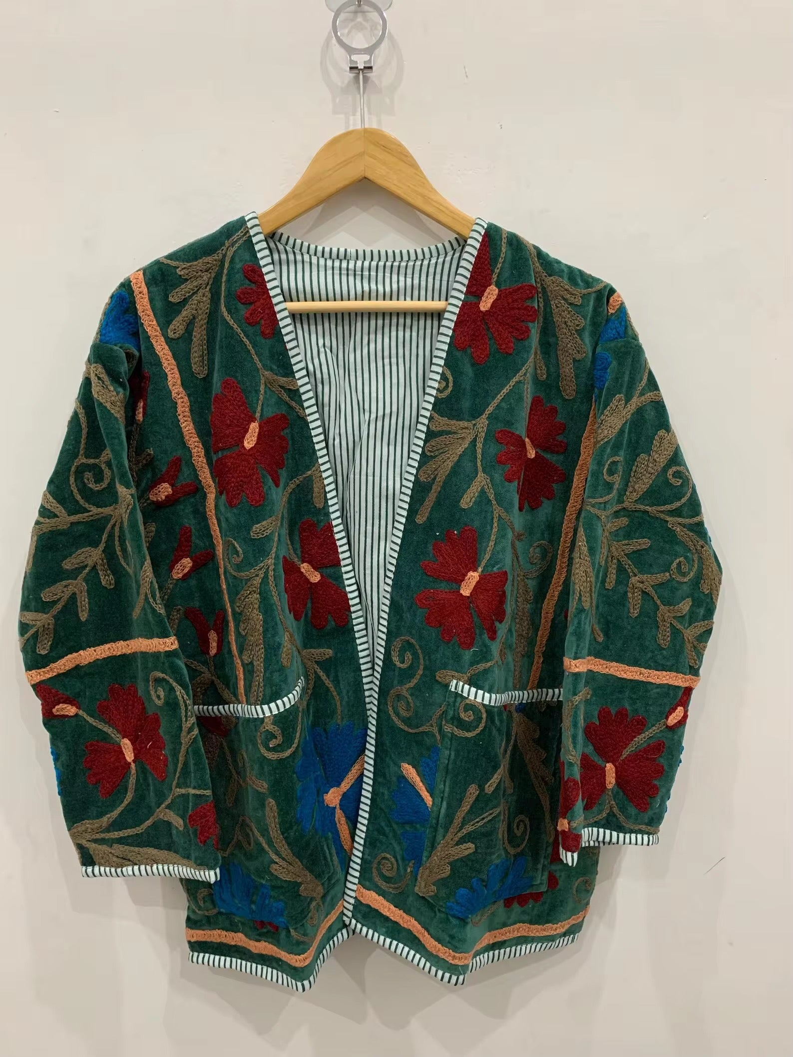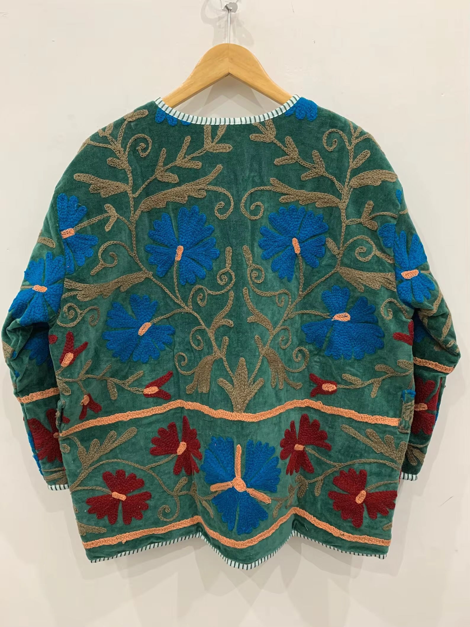 Diseñado para quienes valoran la artesanía, el color y la historia en cada puntada. Este saco es una pieza única elaborada con esmero en India, bordado a mano con la técnica Suzani, que destaca por sus exquisitas formas ornamentales y vibrantes combinaciones de colores.