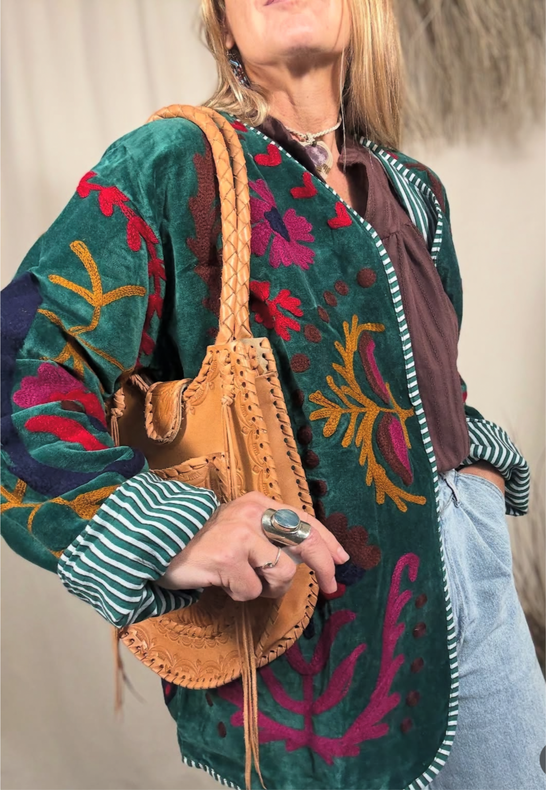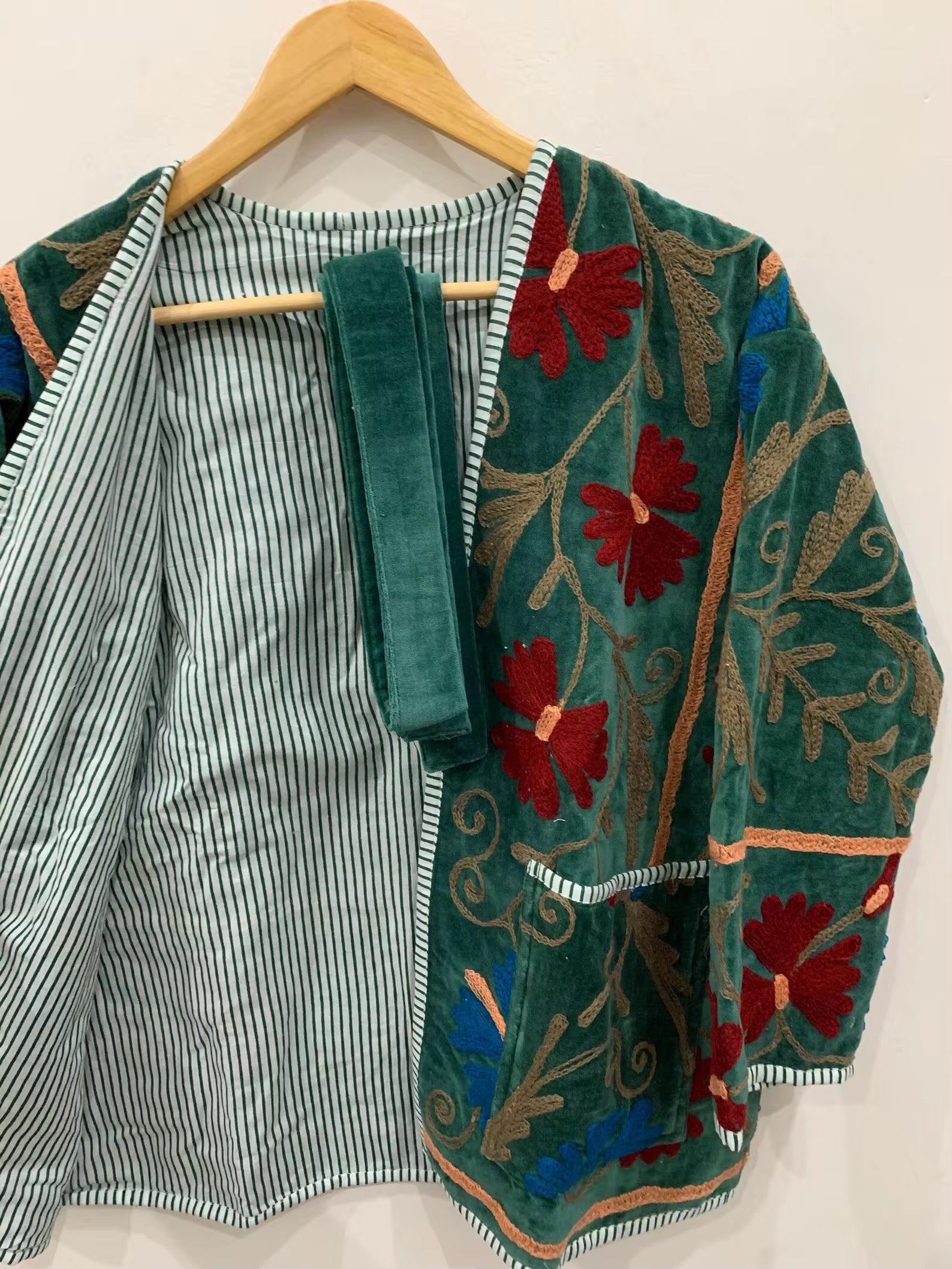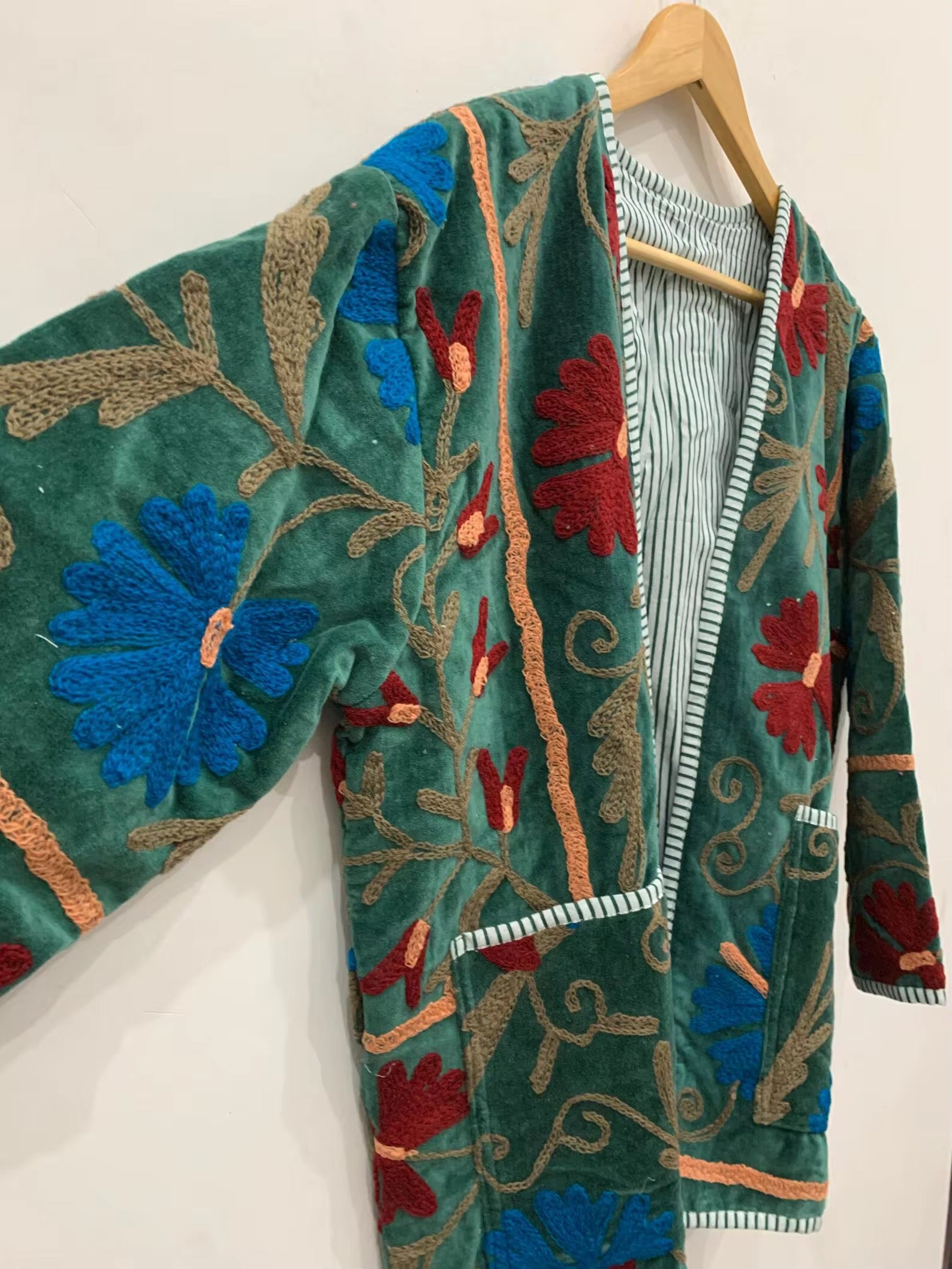 Diseñado para quienes valoran la artesanía, el color y la historia en cada puntada. Este saco es una pieza única elaborada con esmero en India, bordado a mano con la técnica Suzani, que destaca por sus exquisitas formas ornamentales y vibrantes combinaciones de colores.