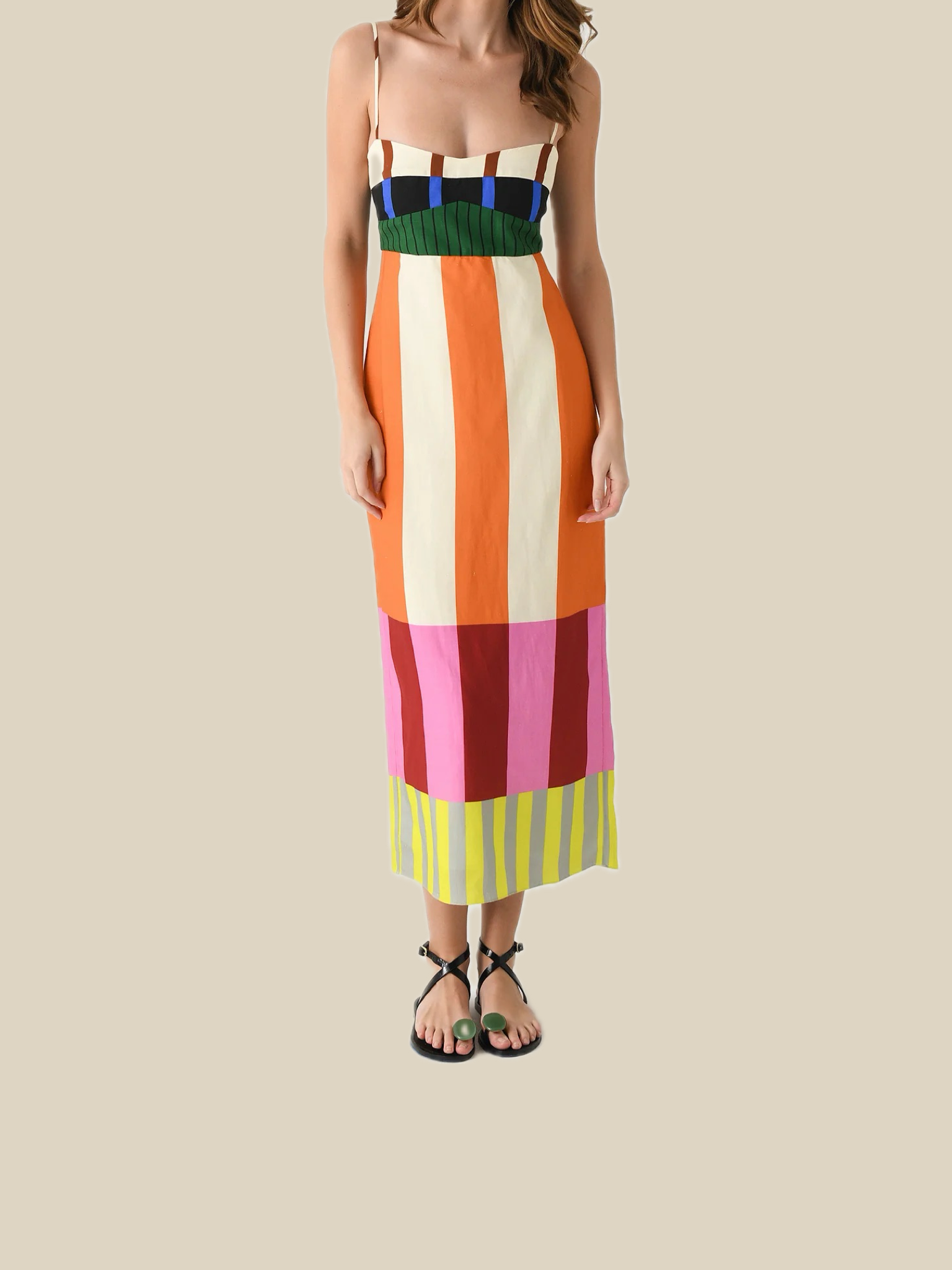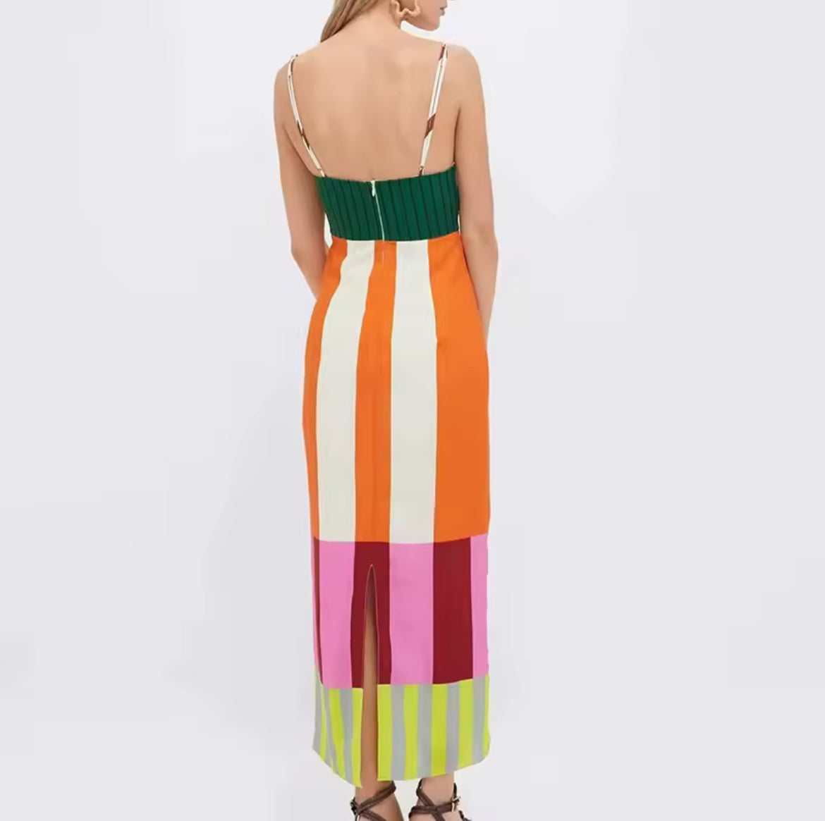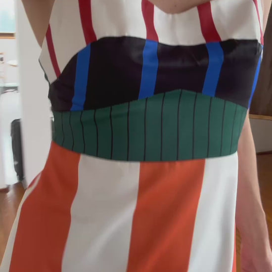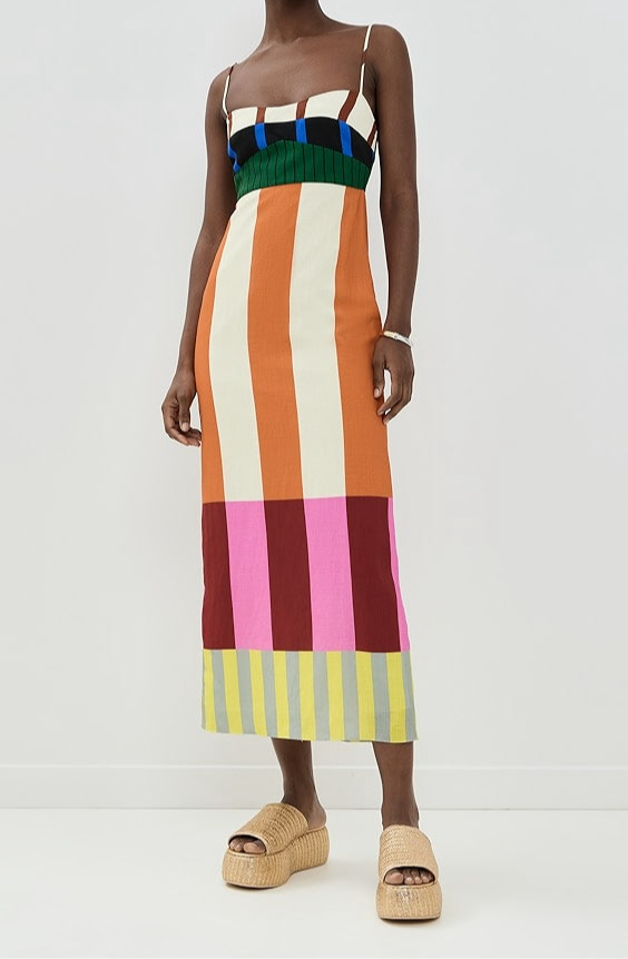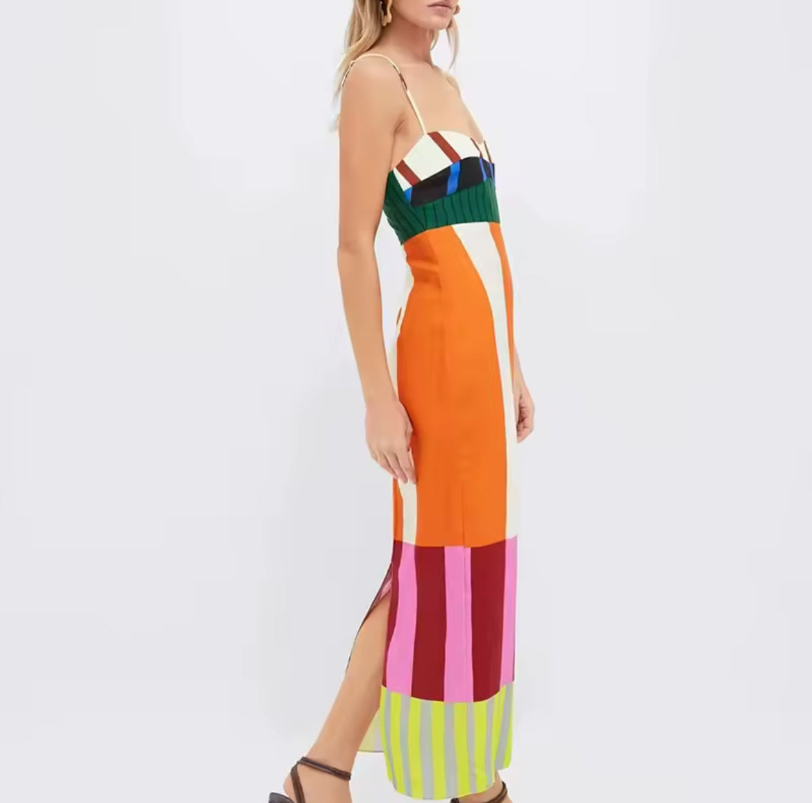 Destaca con el vestido Emilia, una prenda atrevida y sofisticada diseñada para mujeres que aman expresarse a través de la moda. Con un llamativo diseño de bloques de color en tonos ricos y vibrantes, este vestido combina la elegancia moderna con un toque divertido.